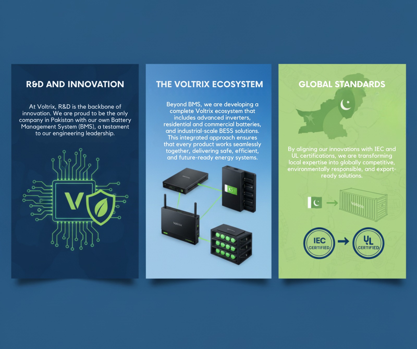 At Voltrix, R&D is the engine of progress. We are proud to be Pakistan’s pioneer in Battery Management Systems (BMS), leading innovation in smart energy. Our R&D team continuously develops advanced inverters, residential and industrial battery systems, and large-scale BESS solutions — shaping a sustainable energy future.